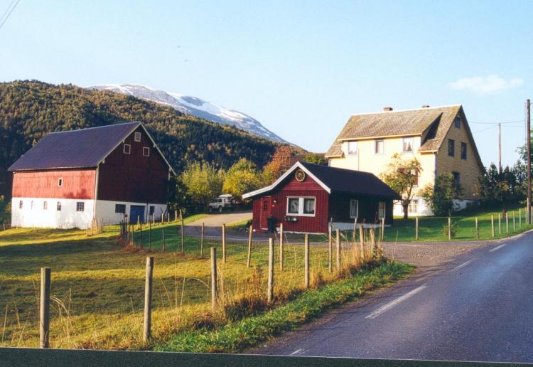 Bilde-id: 2895_00 Dato: 29.9.2000 CaAar: 2000 Bildetekst: Isakebruket i Loen med låve, våningshus og garasje sett frå Stubben