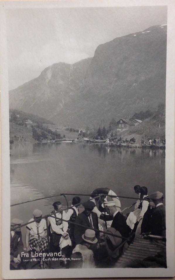 Loenvand 1926 Carl Normann. Viser Vassenden med hus og hesteskysss som venter langs veien. Bildet er tatt fra båt på vei nedover. Kopi av postkort lagt ut på facebook av Jorunn B Hjelle.