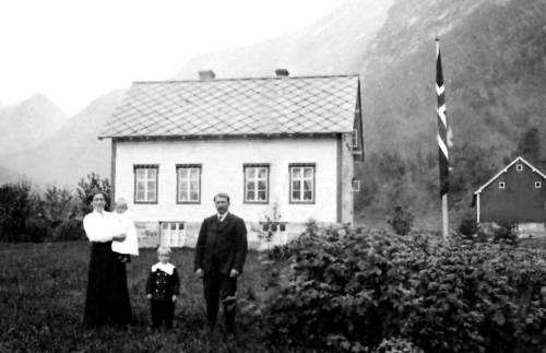 Ca. år: 1910, Veper366.jpg 1910110 / Person / Bødal / Type: BRO Slekt / Fam. Elias og Ingeborg Bødal foran Erik-bruket. Barn Johan og Wilhelm (