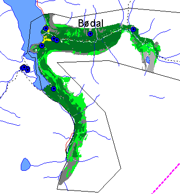 Garden Bødal har innmarka si ved utlaupet av Bødalselva. Garden omfattar Bødalen med Bødalssetra. Denne dalen går heilt inn under Bødalsbreen. Vidare høyrer nordre del av Kjenndalen til Bødal (arealet på nordaust sida av elva). Denne dalen endar også i ein arm av Jostedalsbreen (Kjenndalsbreen).