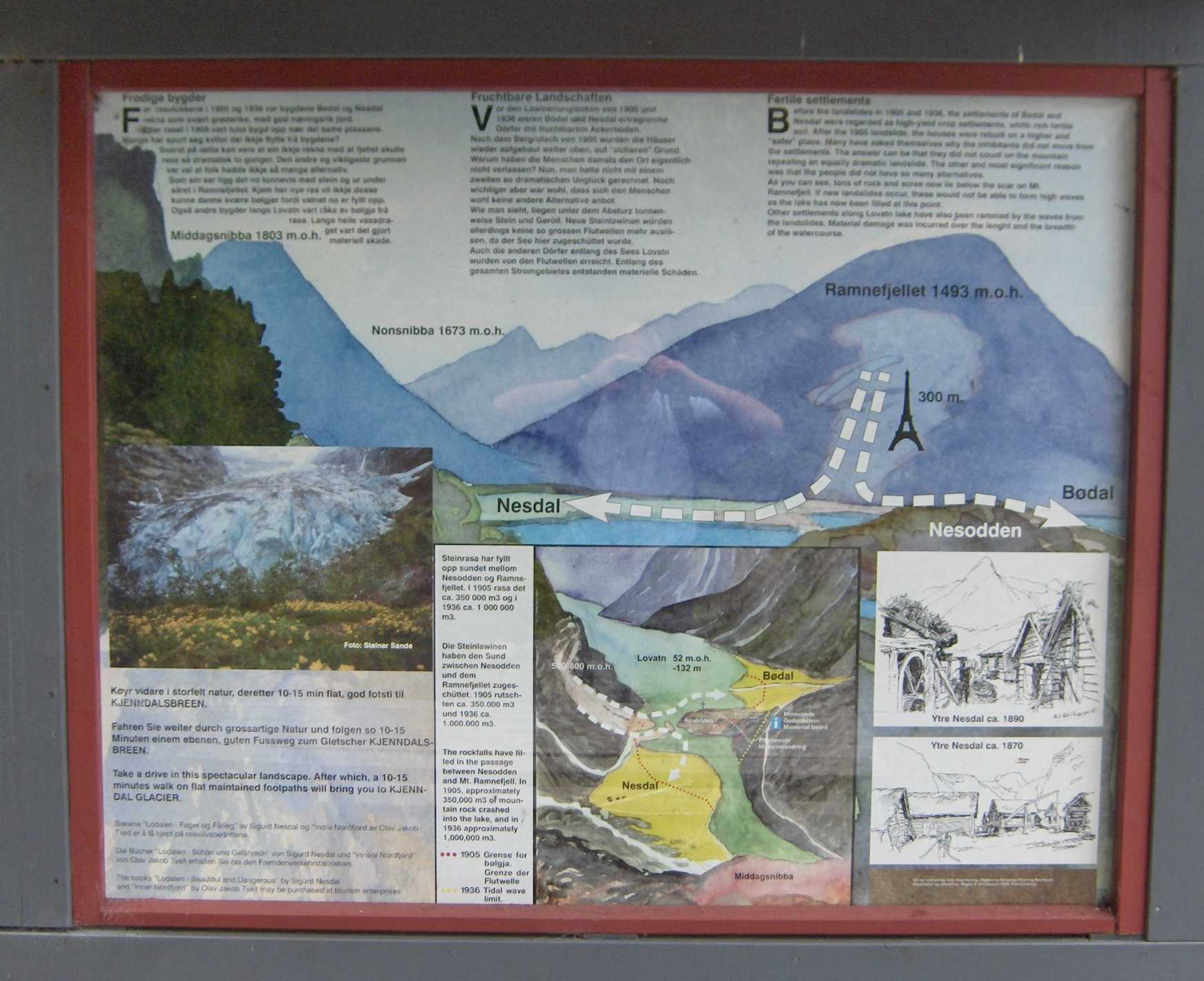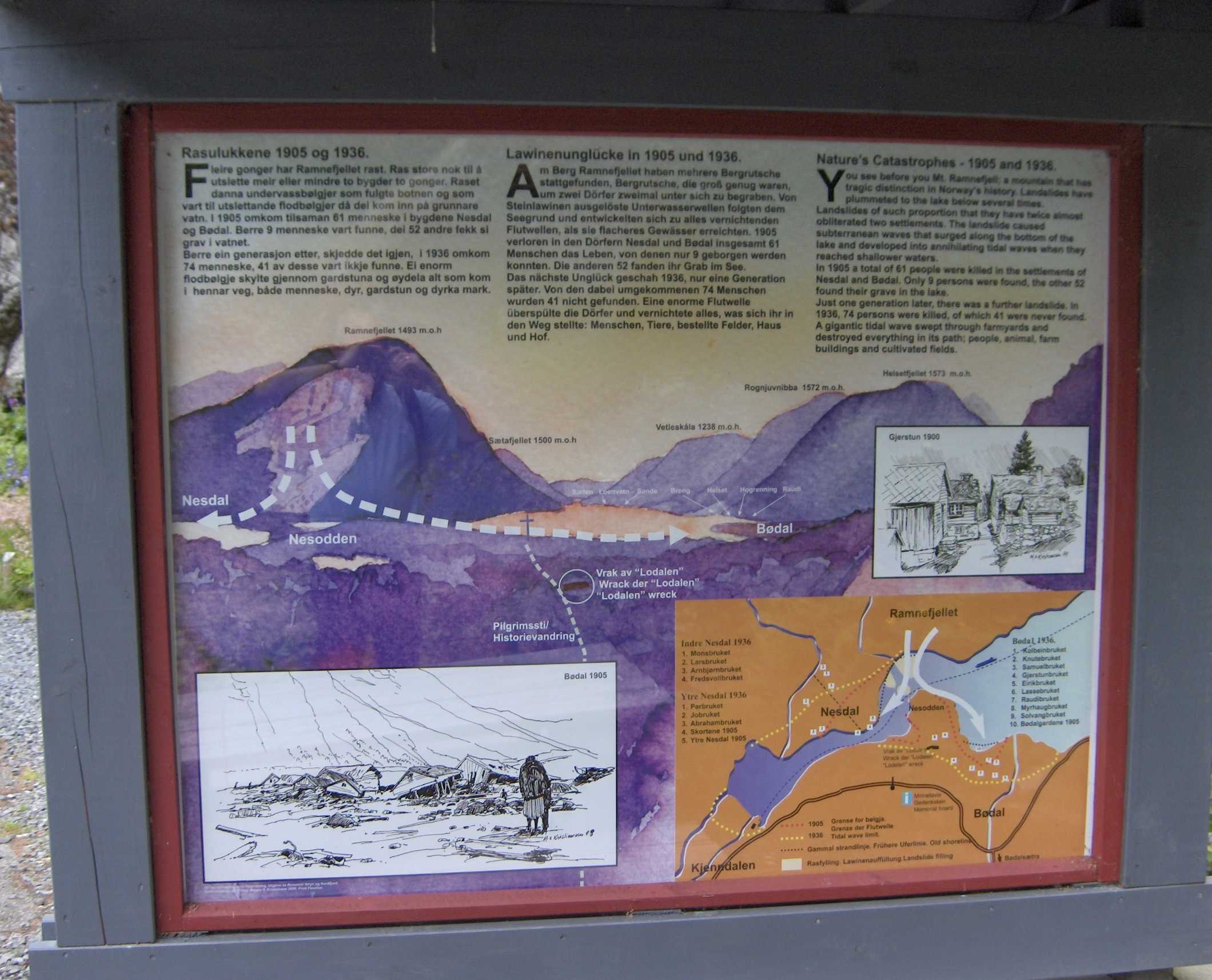 Tur: Historisk vandring i Bødal Minnetavla i Kjenndalsvegen . I 1937 vart det sett opp ei minneplate i fjellveggen på det høgaste punktet i den kommunale vegen mot Kjenndalen. Vegen vidare mot Kjenndalen er privat bomveg, og denne vegen har eit enno betre utsiktspunkt mot Ramnefjellet og Nesdal. Minneplata har med namna på alle dei som ikkje vart attfunne ved ulukkene i 1905 og 1936 Det har etter kvart blitt utvida med litt plass for korttidsparkering ved minnetavla, der er oppsette benkar og planta blomster. Det har også blitt sett opp informajonstavle om Lodalen Frå plassen ved minnetavla kan ein sjå vraket av båten Lodalen i ei lita opning i skogen
