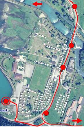Tur: Storerunden i Loen" Frå vegkrysset kan vi ta ein avstikkar til sjøkanten i Lovik. For å kome dit, kryssar vi over fylkesveg 60 ved fotgjengar-overgangen mot Loen skule. For å gjere skulevegen tryggare vart det hausten 2011 laga fartsdempar ved denne overgangen. I Lovik er det i ferd med å bli bygt ut ei båthamne og ein miljømøteplass. Det var hasuten 2011 på plass 6 naustrom og skal kome fleire og det skal kome flytebryggjer. Vidare vart det hausten 2011 åpna sandvollybane og gapahunk i regi av 4H. Frå utsiktsplassen i Lovik er det utsikt mot skulebygget/grenmdahuset, ballbingen og idrettsplassen til Loen idrerttslag Neste stopp er ved vegkrysset der den kommunale vegen møter fylkesveg 60. |