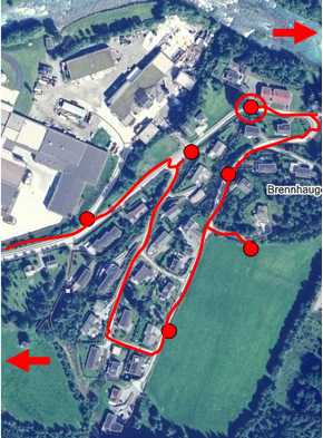Nokre gonger når vi går storerudnen, føl vi kommunevegen rundt bustadfeltet på Brennhaugen, men nokre gonger går vi gjennom bustadfelet. Denne presentasjonen har med tur gjennom bustadfeltet. Akkurat der vegen går opp til Brennhaugen ligg tomta til undomshuset på nedsida av kommune-vegen. Ungdomshuset er er rive og det er bygt nytt rekkehus på tomta. Ungdomshuset heitte Heimtun og derfor har eg kalla dette punktet for for Heimtun-tomta.