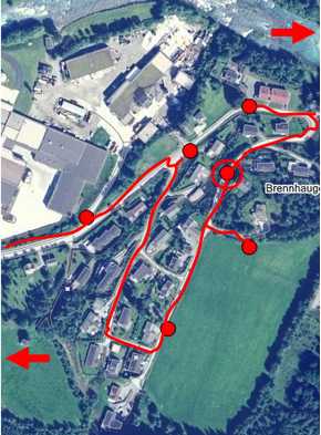 Ved heimtuntomta går det stikkvelg frå den kommunale vegen og opp til bustadfeltet på Brennhaugen. Frå toppen av stikkvegen til bustadsfeltet er det utsyn over Bustadsfeltet i Lovik, anlegget til Nordfjord kjøtt AS (NK), fjorden med hotella og Lotunet.