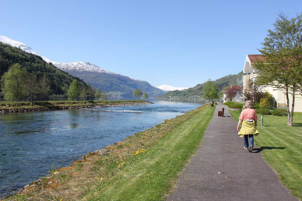 Hotel Loenfjord er bygd på utfylt grunn i det gamle elvelaupet. Rundturen går på baksida av hotellet langs Loelva og med fjellet Skåla som bakgrunn. Frå stien ved utlaupet av elva er det også fin utsikt mot Hotel Alexandra og bustadfeltet i Heggelia. Det er også utsikt til Loen skule/barnehage på utfylt grunn på andre sida av elva. Vidare er det flott utsikt utover fjorden.