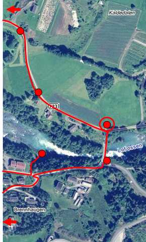 Fylkesvegen på nordsida av Loelva går vidare oppoer Lodalen frå vegkrysset ved Lofossen. Denne fotturen går imilertid over brua og mot Lovik langs det som i dag er kommunal veg.