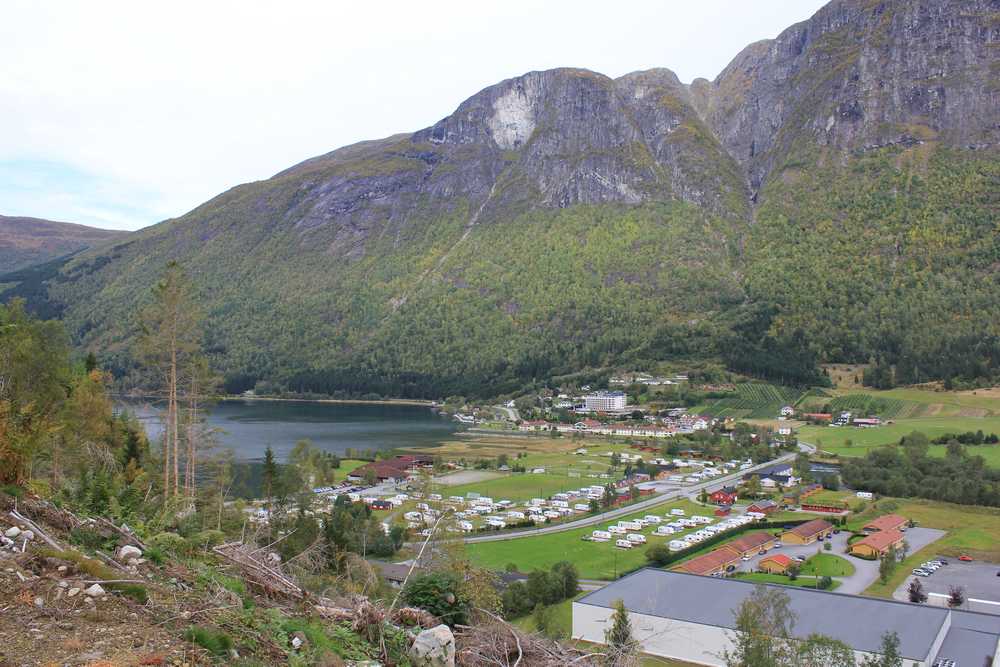 Frå neste utsiktspunktet ved brua er det med bilde over hyttene på Grandane.
