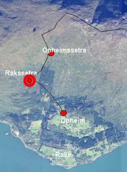 Setrevegen går vidare frå Rakssetra til Opheimssetra gjennom krattskog i skoggrensa. Opheimssetra er synleg frå Rakssetra.