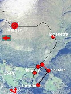Frå varden går stien austover i omlag same høgd innover mot Grimedalen. Deretter går stien rett ned på Høgesetra.