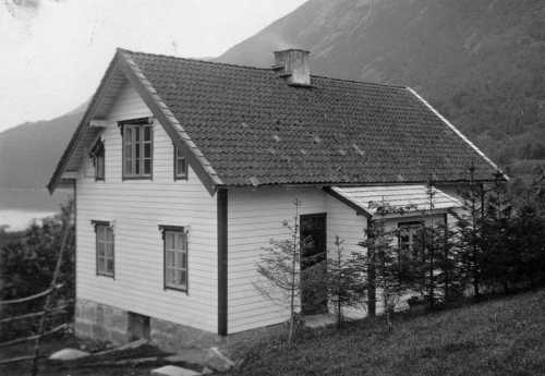 Postkort. Våningshuset på Magnebruket i Loen, det gamle nedanfor Arnehuset som vart rive etter utskiftninga før 1970. Utlånt frå Karen Loen. Original: Audun Loen's postkortarkiv.