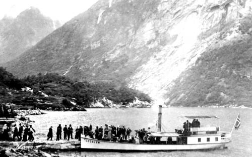 Same bilde skanna frå Fjordingen 18. april 2005 med følgjande tekst: 569. Norge. Loenvand. Eneberettiget Mittet & Co. Bildet er teke ca 1910 - 1912. Dampskipet Lodølen set av passasjerar ved kaia i Bødal. Bødalsetra og Bødalsbreen var også populære turistmål. Breen gjekk mykje lenger ned enn no og overrettssakførar Ole Loen hadde sett opp ei turisthytte på sætra. Denne vart overerteken av Alexandra og seinare flytta og tilbygt restauranten på Kjenndalssanden (ca 1921) Båten er Lodølen. |  |
