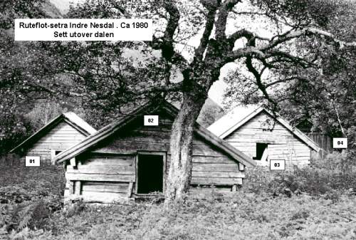 Ca. år: 1980, Ruteflot-setra Indre Nesdal . Ca 1980 Sett utover dalen Frå venstre:Lars, Mons, Anbjørn og Fredsvoll-selet