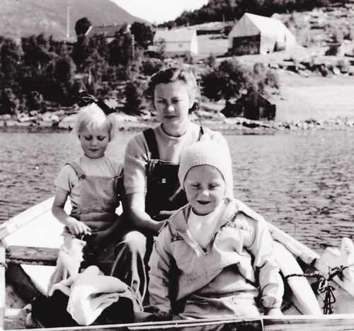 Ca. år: 1955, Ferie i Eivindvik tidlig 50-tall. Hege, Ingrid og Jørgen. Gården i bakgrunnen, Ikke tidfestet men ca 1955-1960