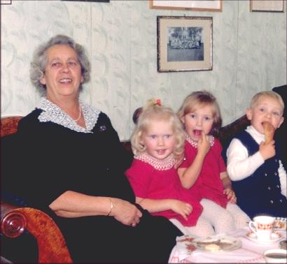 Ca. år: 1971, Frå venstre: Martha Haug, Tove Blikseth, Ann-Kristin Blikset, Hans Inge Huuse og mor til Hans Huuse ved kaffebordet på Algarheim. Utsnitt som viser Martha og dei 3 barna