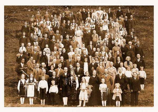 | | Ca. år: 1935, Gjester ved Sigurd Bødal og Dorthea Loen sitt bryllaup. Til høgre står familien til Dorthea. Dei vaksne er Helga og Lars (foreldre) , Arne og Olav (søsken). Bildet er kopiert frå Facebook. Lagt ut av Lars Kåre Skeide, Det er Audun som har identifisert Arne-familien. |  |