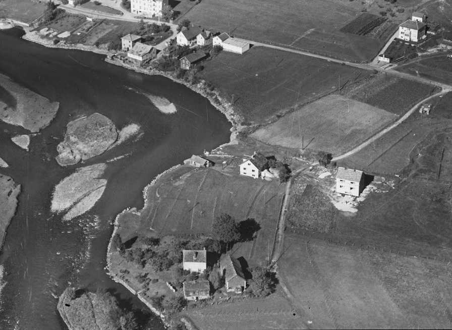 2. Flybilde som viser bustadar ved utlaupet av Loelva. 1954