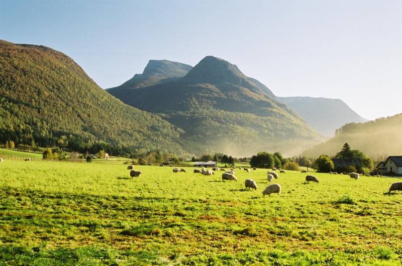 13.17. mai med sauer og lam på bøen og Skåla i bakgrunnen.