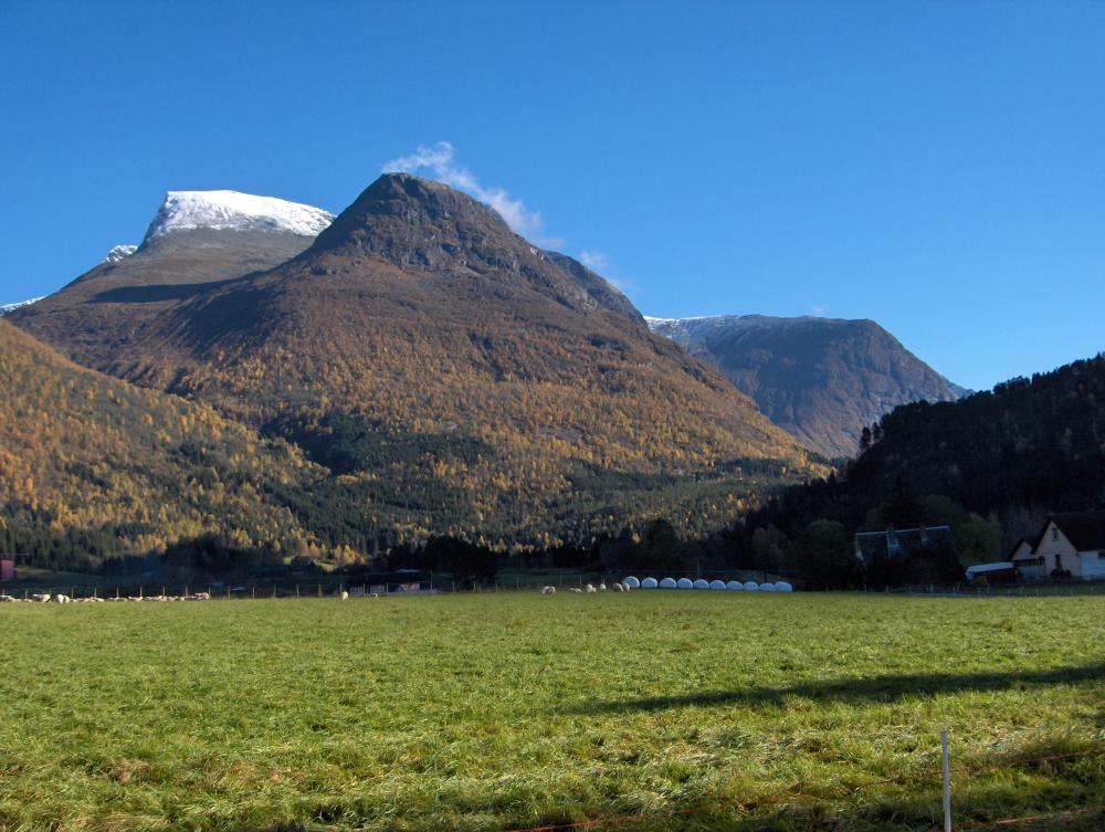 28. Utsikt mot Skåla frå Lotunet om hausten med den første snøen på toppen