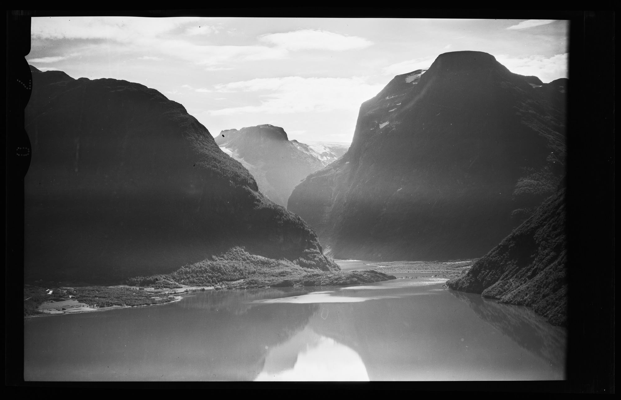 Det var ingen nærbilde frå den innerste delen av Lodalen i denne flybildeserien. På dette bildet ser ein garden Bødal, gardsnr 77 inn til venstre og gardane i Nesdal inn til høgre; Nesda indre, gardsnr 78 og Nesdal ytre, gardsnr 79