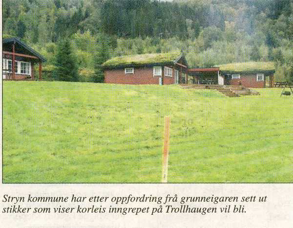 Arne Loen som etter gjeldande planforslag må avstå to tredjedeler av den 16,6 dekar store eigedomen Trollhaugen, har skissert ei løysing med justert veglinje. Men han står fast på a parkeringsplassen mellom hyttene og byggefeltet må takast ut av planen. Arne Loen meiner Nordfjord Kjøtt sitt behov for parkeringsareal kan reduserast ved bygging av parkeringshus i fleire plan på nordsida av planlagt veg.