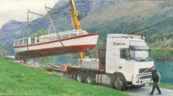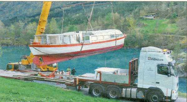 Båten kjem med biltransport til Bergen. Vi har inne søknad om dispensasjon for å segle opp til Loen. Derifrå blir det spesialtransport til i Lovatnet.