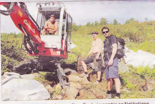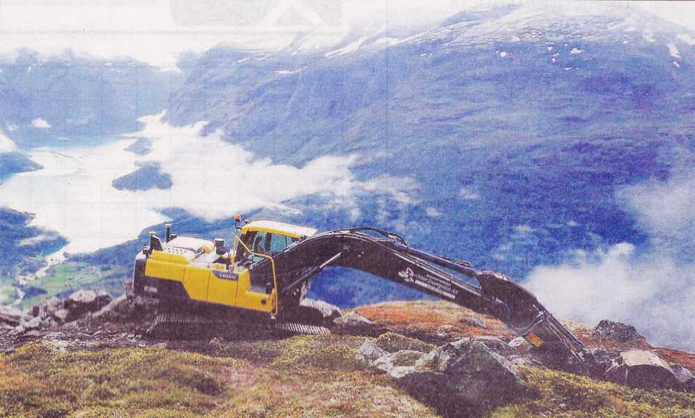 Vi er no godt i gang, og det er kjekt å kunne vise fram kor flott dette vert. Grunneigarar og lokale interessentar elles har vore og er positive til jobben som blir gjort. I år vil det bli bygd stiar for 1,9 millionar kroner, der 4OO.OOO kroner kjem i form av infrastrukturtiltak frå fylkeskommunen, seier Ole Runar Aabrekk i Utmarksressurs AS og Rune Holen i Naturservice DA. Fjordingen var med dei to til Oppheimssætra fredag morgon for å sjå på stien som tek form. Finn Drageset i gravemaskina med edderkoppføter har med seg hjelpemann og byggjer 16 nye meter sti kvar dag. Til å hjelpe seg har dei stein og grus som vert flydd opp i 5OO kg sekkar av Fjord Helikopter. Stein og grus vert levert av Stryn Pulk og Yri sand, alle lokale verksemder.