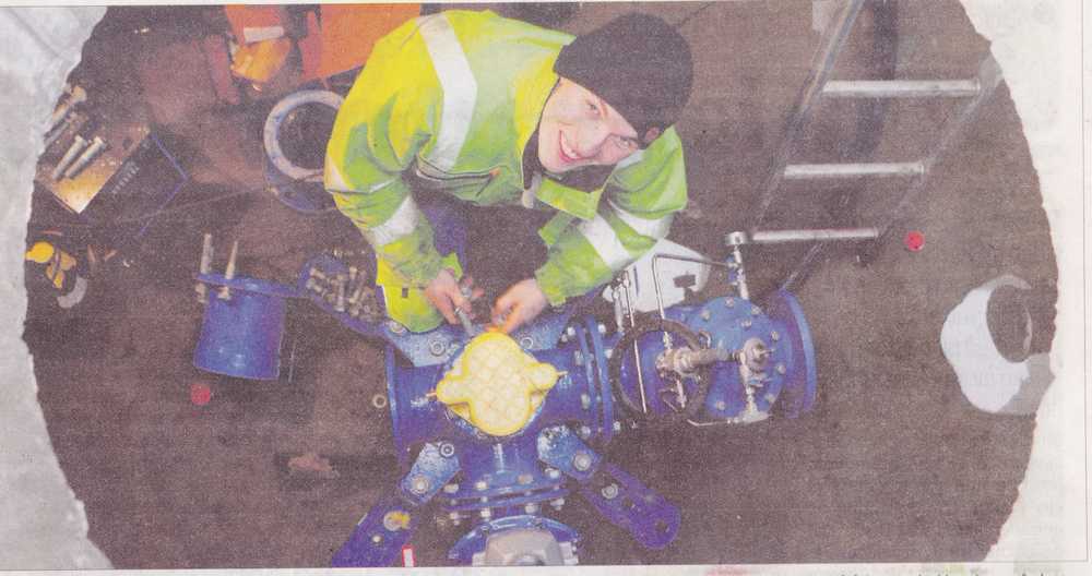 Klar for påkopling frå Loen Maskinførar for Kveen AS, Sigurd Berge, i kummen på Visnes der vassrøyr frå Loen skal koplast på dette store flenskrysset. Heile 17 kilometer med røyr skal reinsast, klorast og reinsast igjen den komande veka.