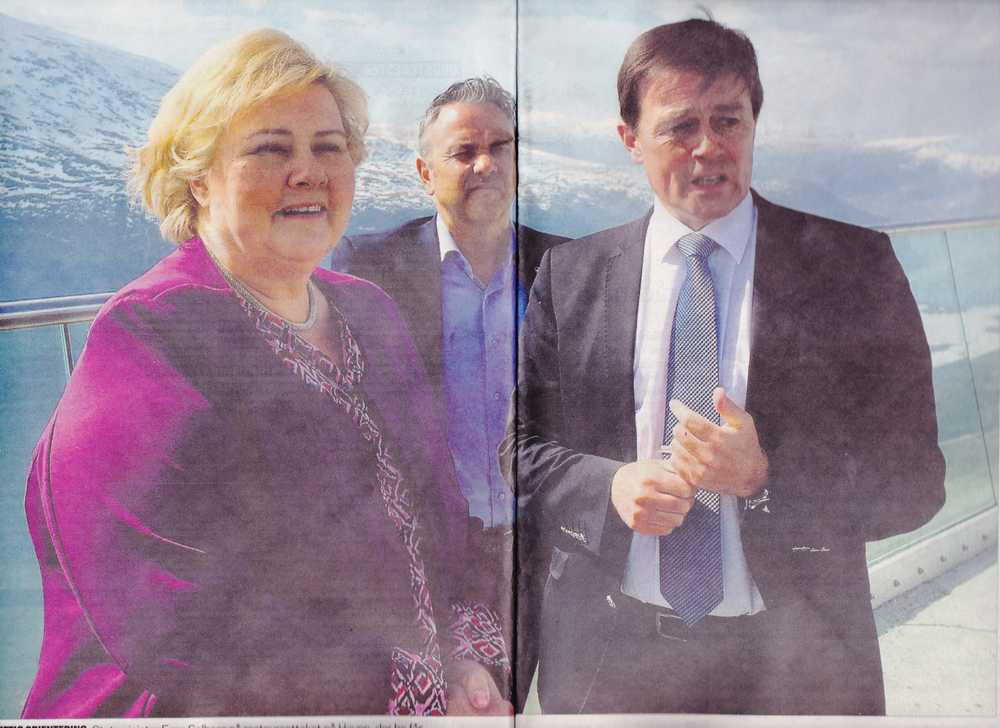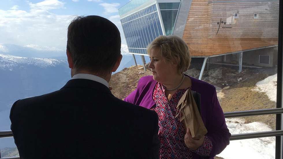 Bildetekst: Statsminister Erna Solberg var ein av 110500 gjester ved Loen skylift i 2019. Dagleg leiar Ricard Grov med ryggen til. Arkivfoto: Roger Oldeide