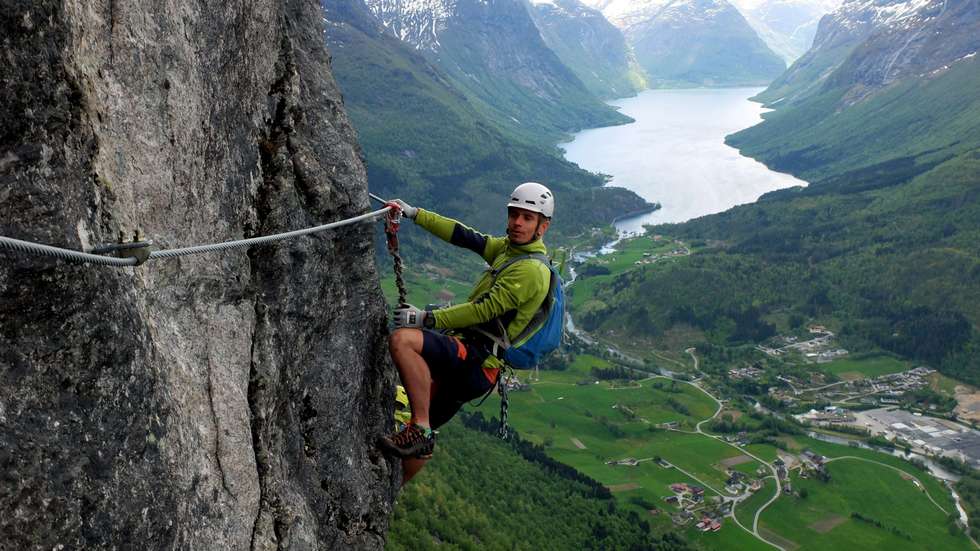 Bildetekst: Den nye klatreruta "Ragnarok" er ikkje for kven som helst. Den vart ein del av Via Ferrata 18. mai 2019. Foto: Loen Active