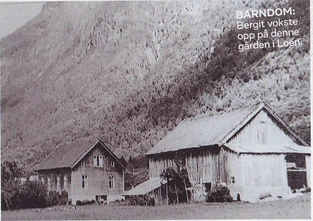 Bergit, fødd og oppvaksen i Loen, kom til verda 17. desember i 1929. Faren heitte Oskar, mora kom frå Oldedalen og heitte Kari. Familien hennar hadde kjøpt ein gard på Ørskog, og denne tok foreldra til Bergit over. Men Oskar lengta alltid heim til Loen, og etter kvart flytta dei tilbake hit.