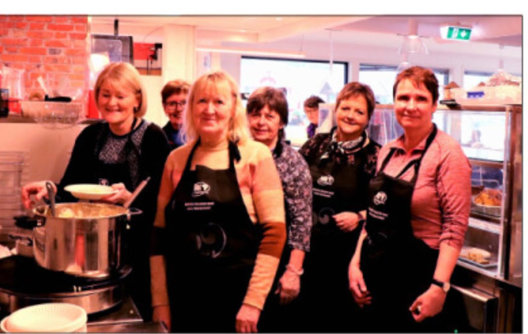 Kjekt at det kjem mykje folk, seier Anne Sæten som auser opp grauten i lag med Berit Hogrenning, Else Loen, Karin Auflem, Lill-Berit Tjugen og Inga Bødal.