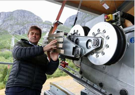 Skyliften står. Richard Grov,dagleg leiar ved lown Skylift, viser bærekabelen og hjul på tappen av kabinen som ligg opp på kabelen når anlegget er i drift.