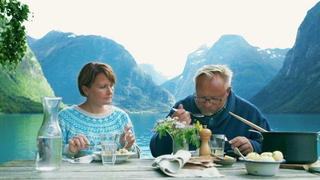 Lodalen som kulissar. Grete Haugen Vinsrygg har spelt inn reklamefilm for fårikål saman med meistarkokken Bent Stiansen på Hogrenningssætra i Lodalen. Foto: Frå Reklamefilmen/Rema 1000