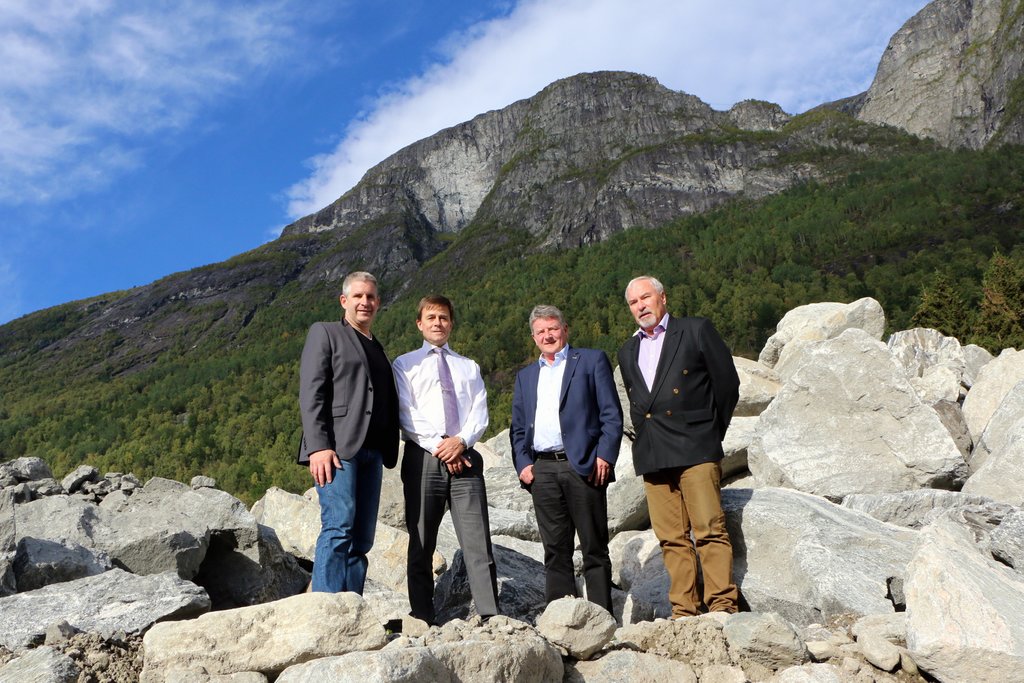 Trykkbelastning. Store steinmengder på tomta ved fjorden september 2015. F.v. Seb Lüönd i Doppelmayr Garventa, Richard Grov, Peter Baumann i Garventa og Leif Riksheim. Arkivfoto: Bengt Flaten