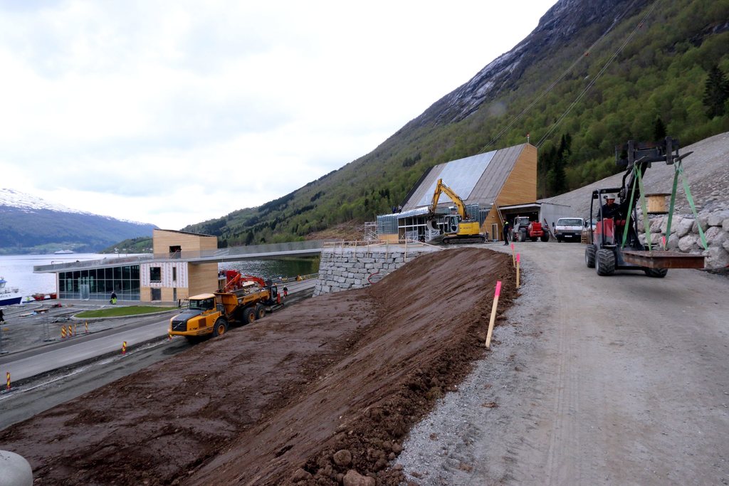 Loen Skylift sin fjordstasjon skulle etter planen stå på fylling ute i fjorden.