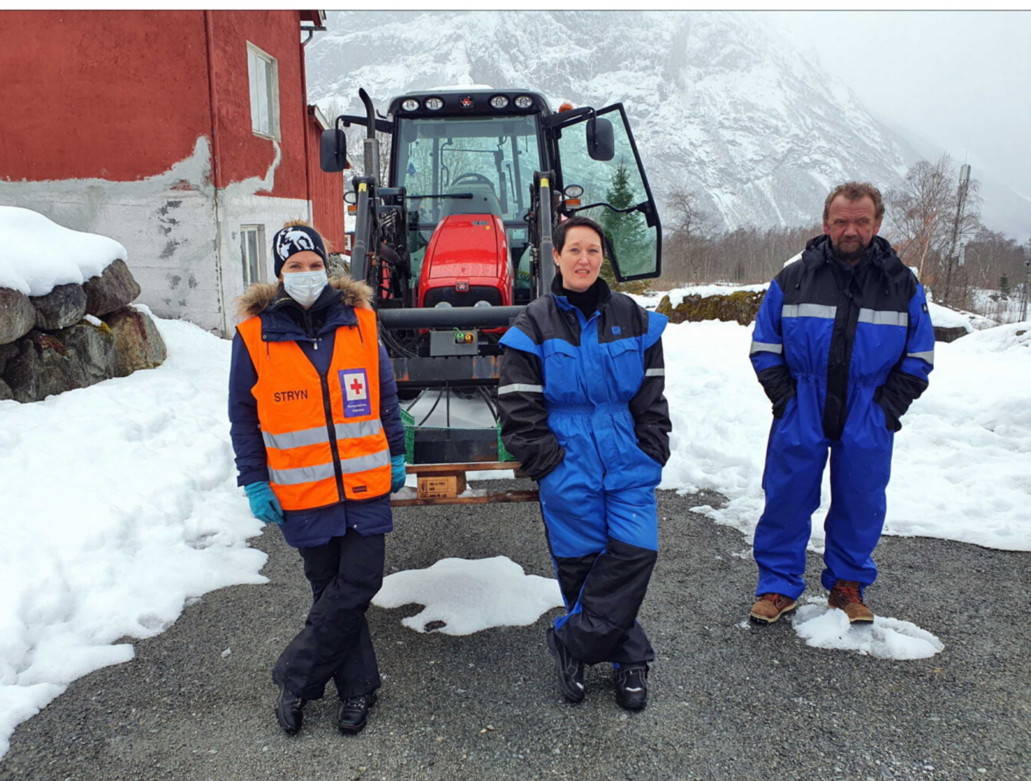 Gode hjelparar. Etter god hjelp frå Olden Raude Kross tidleg i veka, var det Stryn Røde Kors Hjelpekorps som var på plass med forsyningar av mat og drivstoff etter påske. Då slo også ordførar per kjøllesdal følge. Her er Anne Sølvi Sande (i midten) saman med Siv Solberg frå Hjelpekorpset og Per kjøllesdal. Foto: Stryn Røde Kors