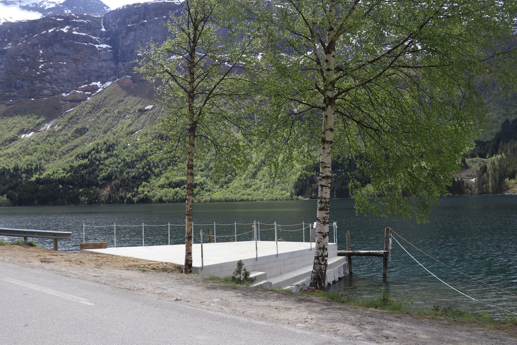 Flytta. Fjordstasjonen skulle etter planen ligge ute i fjorden, men for å unngå å belaste grunnforholda der vart den flytta inn på andre sida av fylkesvegen. Arkivfoto: Bengt Flaten