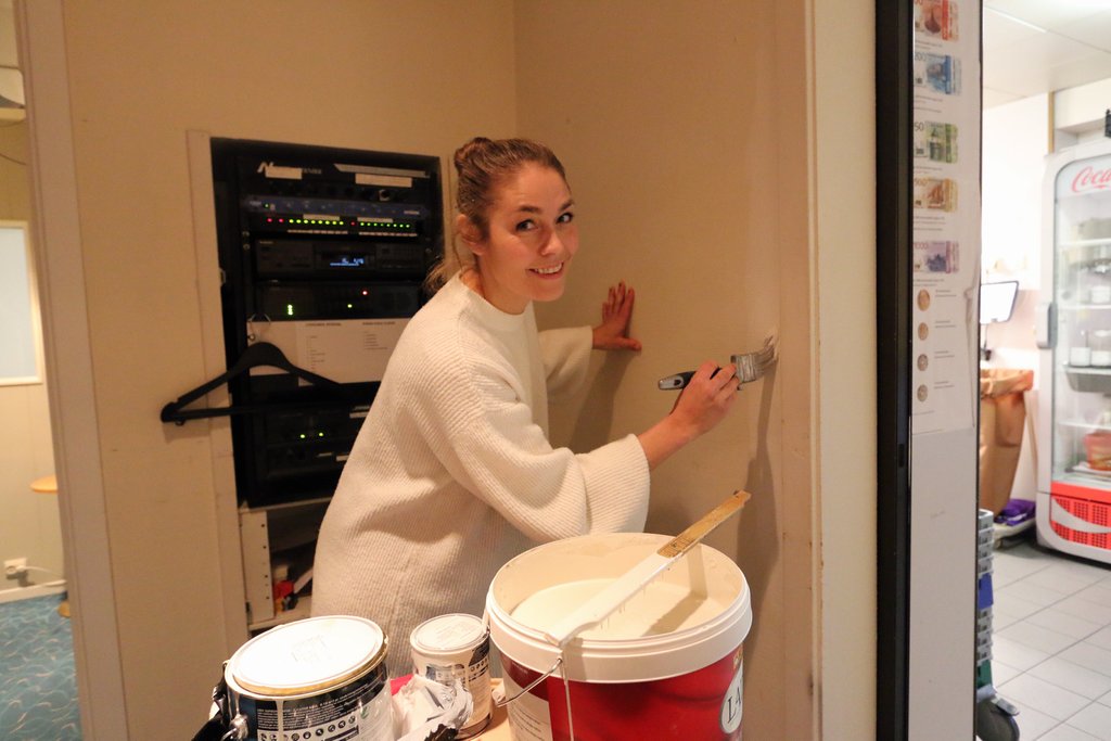 Frå hovmeister til målarmeister. Måling av vegger og dørkarmar er noko av det hovmeister Anette Kvamme skal styre med dei neste vekene.