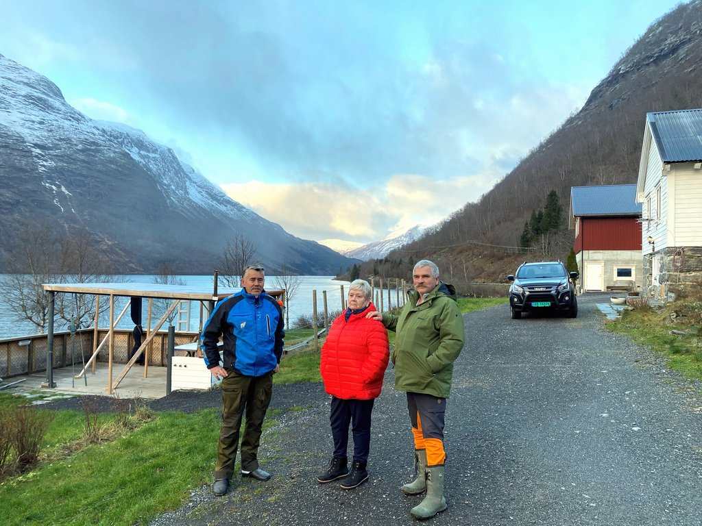 Robin Sande og kona Fride Fjellheim Sande med dottera Emmeline i bakgrunnen. Utsikt oppover Lovatnet