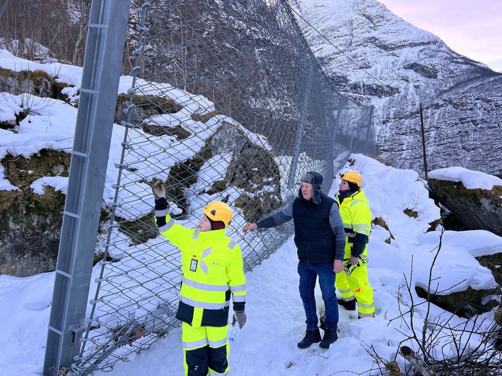 Fanggjerde i Lodalen skal sikre turistane mot steinsprang. F.v: Prosjektleiar Silje Storevik Moe, Jens Hogrenning og kontrollingeniør Tomas Gjerde.