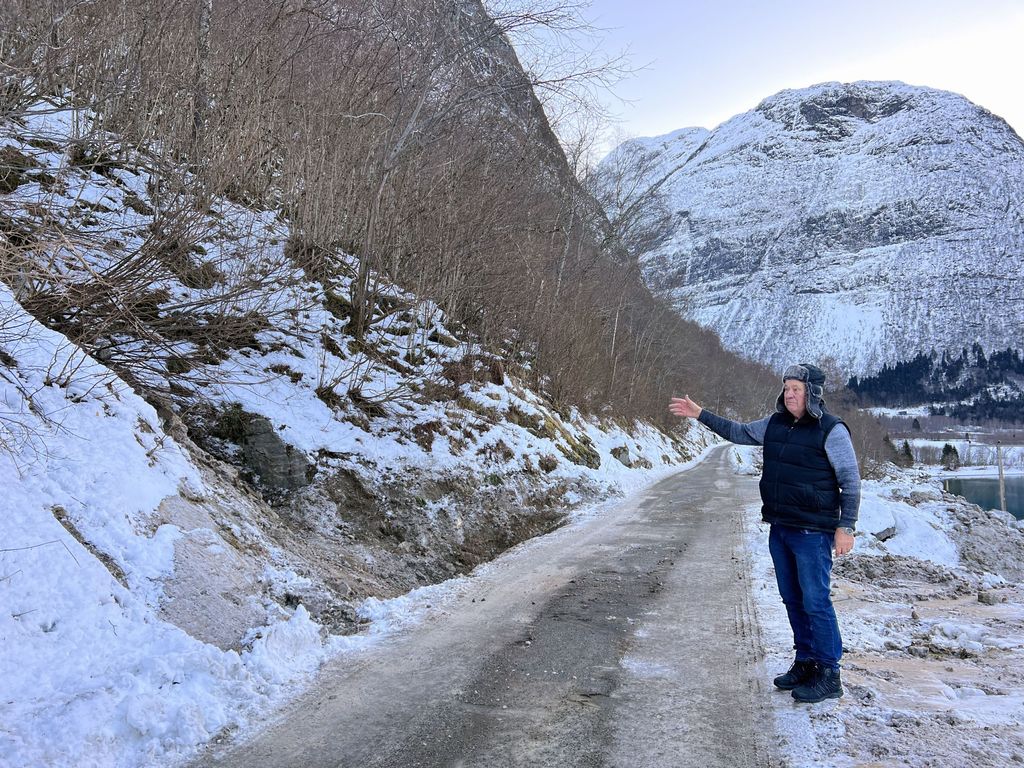No har det vore kaldt lenge, og isen kan brått leggje seg på Lovatnet. Då er det ikkje hjelp i båt, om vegen skulle bli stengt av nye snøskred. Då vert helikopter einaste alternativ. Det er ikkje alltid så enkelt for dei å kome ned. Difor vonar vi som bur her at fylkeksommunen som vegeigar lyttar og tek situasjonen på alvor. Her er fleire skredpunkt, men startar ein med dei som går hyppigast og heller ikkje er så store, er vi på rett veg, seier Hogrenning.