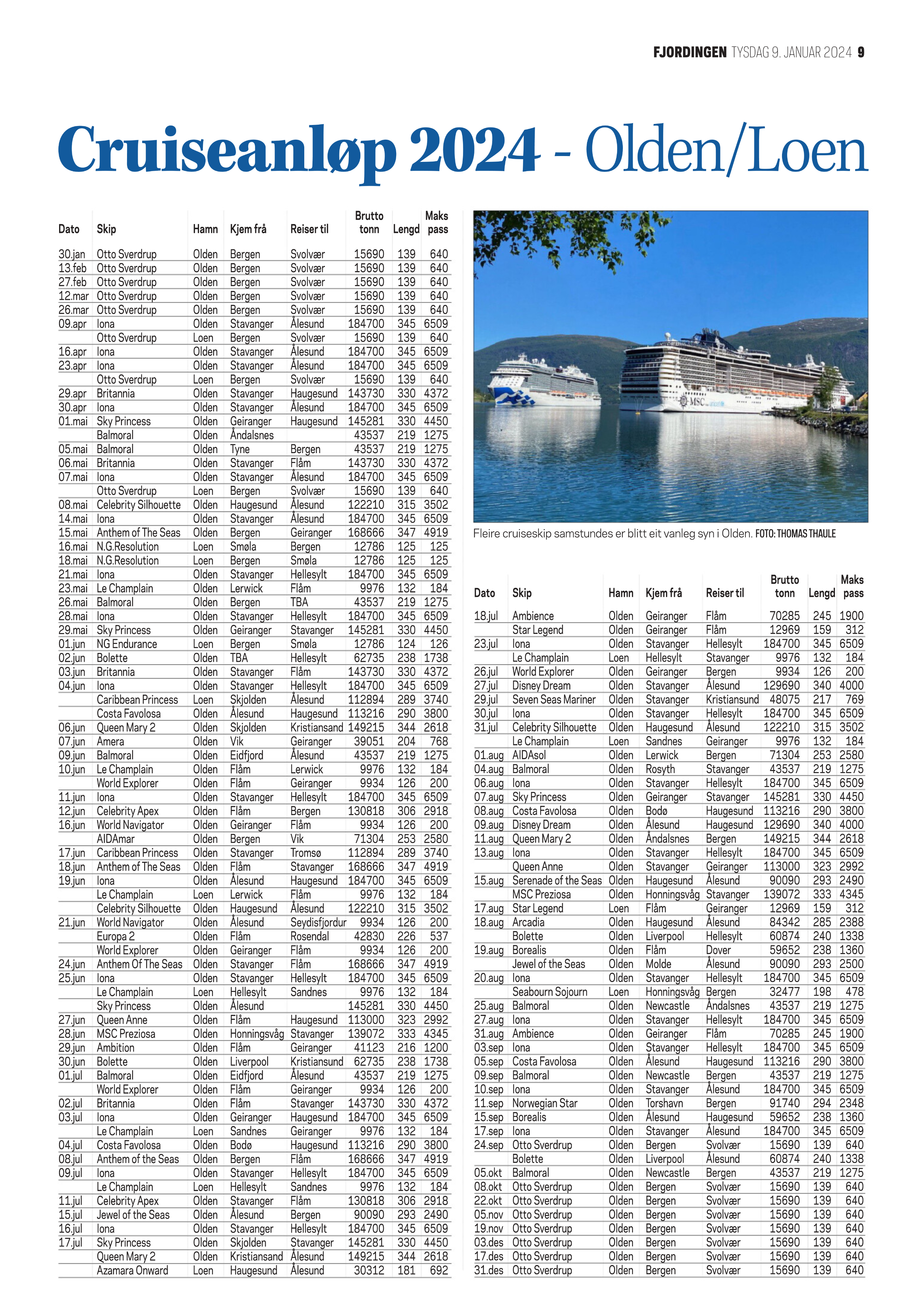 Som dei siste åra blir det cruiseskip inn Nordfjorden i alle årets tolv månader. Men i år blir det så vidt: Hurtigruteskipet Maud skulle ankra opp i Loen den 2. januar, men skipet møtte på såpass tøffe verforhold i Nordsjøen i romjula at det måtte til Tyskland for reparasjon. Dermed blir hurtigruteskipet Otto Sverdrup sitt anløp i Olden 30. januar årets første.