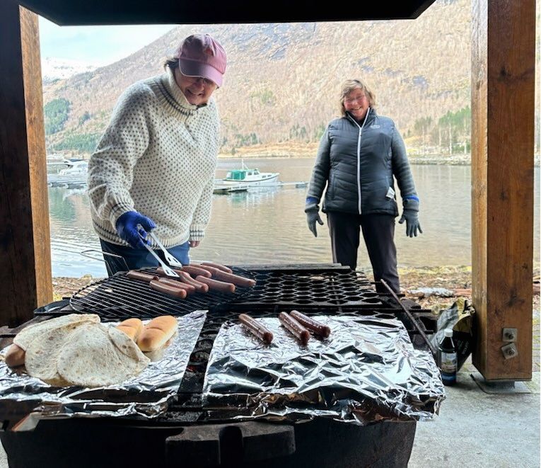 Loen og Rake bygdekvinnelag bidrog på familiedagen 8. mars. Her er det Aud Løvlid og Gunnhild Kvien Moldestad som passar grillen. Foto: Hildegunn Standal Dragsund
