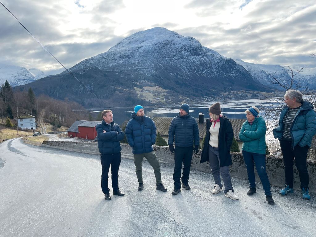 Formannskapet på synfaring av oppheimsvegen. Dei møtte brukarar av vegen som hadde spørsmål til saka. Frå venstre. Olav Lara Rake, Geir Inge Rake, Asgeir Tonning, Stine Rake, Inger Rake, og Ola Rake