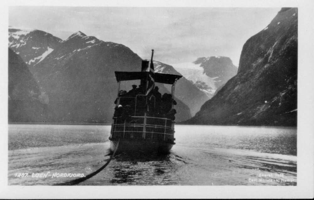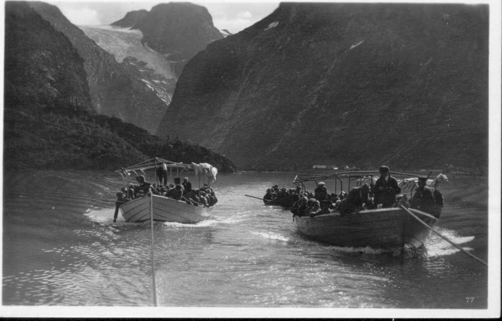 Når man med dampskibe reise indover Nordfjord, saa oppdager man at fjeldene blir høiere jo lenger ind man kommer. Lengst ute ved havet er det kun smaa aaser, som ligger skogbare paa begge sider av fjorden. Lenger inde har birk og or slaat røtter og aasene begynder at hæve sig til spidse knauser. Men jo længer ind en kommer, jo høier blir fjældene, indtil de længst inde hæver sig til høide av 5 - 6 tusen fot. 2 tusen fot oppover er de skogbevokst, men lenger oppe på de høieste topper ligger den evige sne og is .