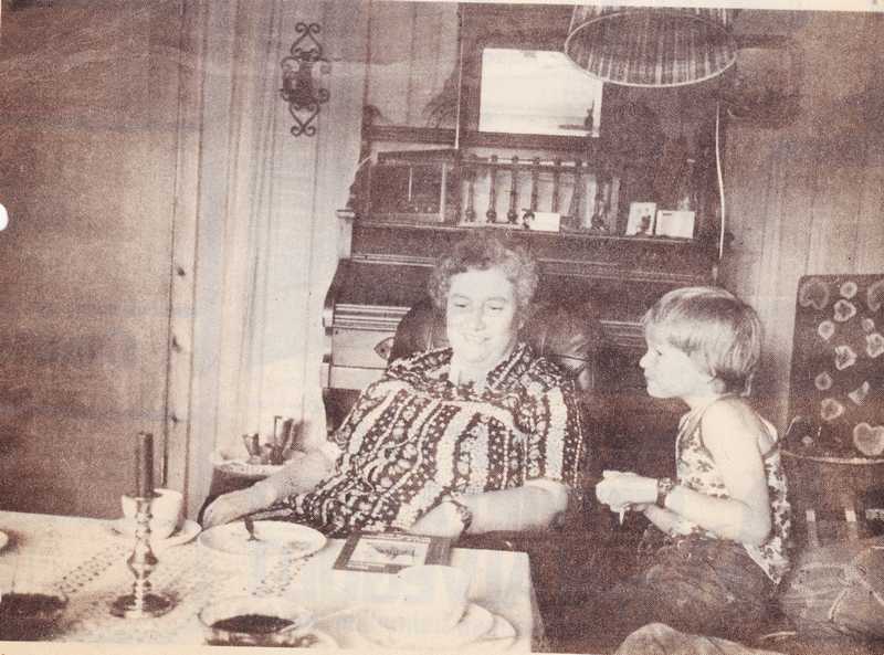 Dei heldt veldig av bestemor si, fortel dei. Riset hekk alltid over døra, og ho truga ofte med det for ho ville at deii skulle bli skikkeleg oppdragne. Men ho var først og fremst snill og god med dei. Og det var fint å vekse opp i Lotunet det var ein spennande verden, med folk i alle husa, og dyr i fjøs og stall og dei var saman i arbeidet og saman i fritida. Og kyrkja låg midt i tunet og samla folk både i sorg og glede og til dei store høgtidene.