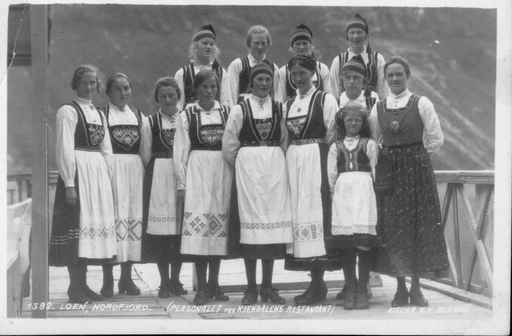1382. Loen, Nordfjord. (Personalet ved Kjendalens restaurant). Atelier K. K. Bergen. Pensjonistgruppa i Loen har hjelpt til med å namngje personane (takk hyggeleg treff!). Første rekke frå venstre: Kristi Sæten, Anna Bødal, Elina Nesdal, (Alo: her manglar namnet på Konstanse gift Bødal????), Borgny Sæten (gift Muri), Dagny Loen, Julia Loen og Ida Loen (g. Saten). Karen Gjerde står fremst. Bak frå venstre: Kella Drageset (g. Tjugen), Karen Loen, Klara Mork og Olina Loen.