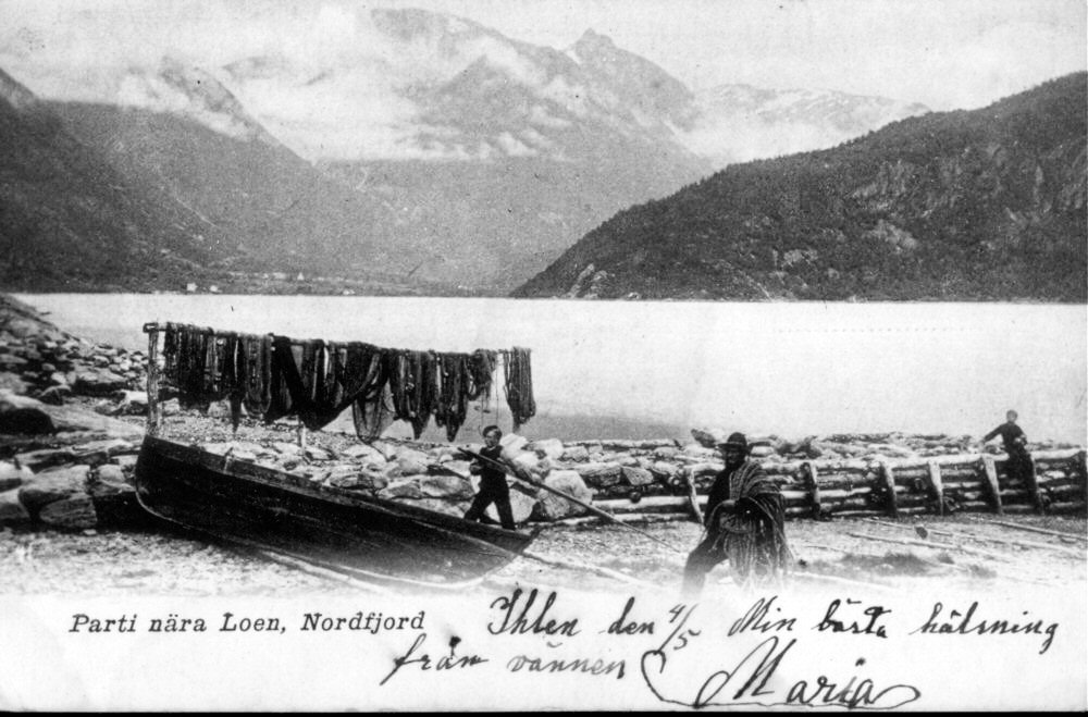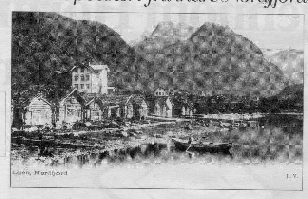 "Loen Nordfjord utgjevar J.V. (Verdenspostforeningen). Fotografiet er truleg teke av Alex Lindahl i perioden 1887 - 1890. Hotel Alexandra og Kvamme's Hotell er måla på kvart av hotella. Legg merke til alle nausta. Kvar gard hadde sitt naust, og det er også grunn til å tru at dei som budde langs Lovatnet også hadde nausttomter ved fjorden"