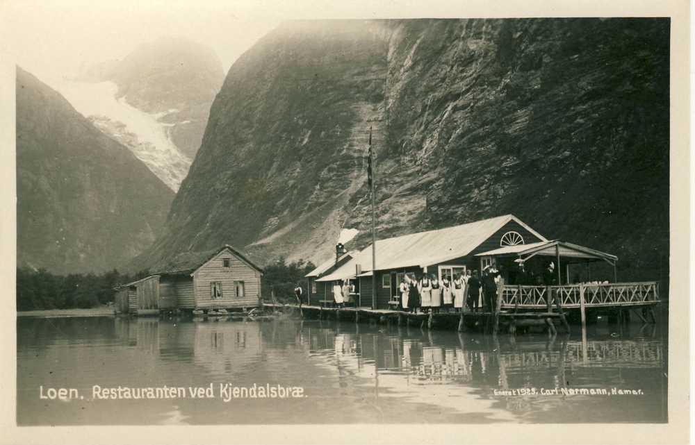 Loen. Restauranten ved Kjendalsbræ. Eneret 1925, Carl Normann, Hamar. Personalet oppstilt for å ta avskjed med middagsgjestene. To av karane vinkar med kvite tørkle. Den delvis overbygde terrassen som går ut i vatnet, har langbord dekka med kvite dukar og serviettar. To av jentene bak i "anretningen " har teke på kvite forklede utanpå bunaden. Oppvasken må gjerast før neste gruppe er på plass. Til venstre stove som Jakob A. Nesdal sette opp ca. 1886.