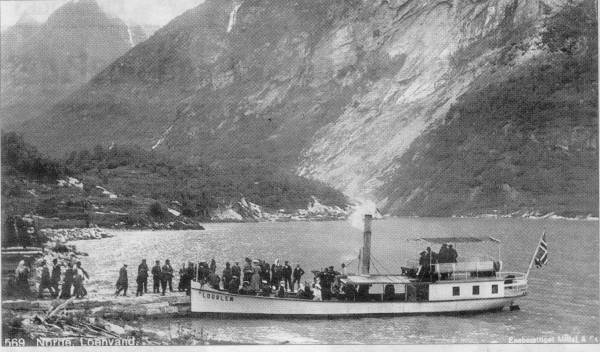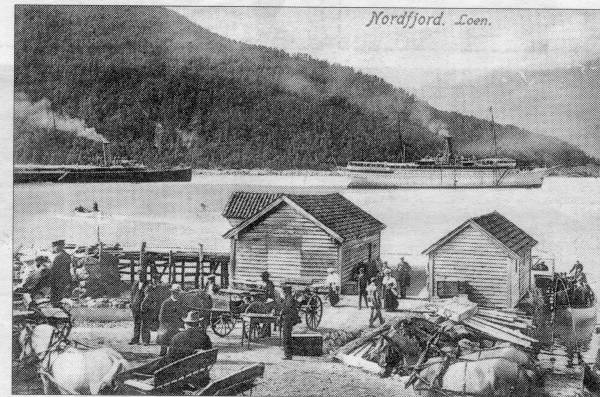 Nordfiord. Loen. O Svanøe Bergen. Eneberettiget 1907. No. 444. Båten til høgre er "Meteor" og den andre kan vere "Midnight Sun". Vi ser at ein "sjalupp" nettopp har lagt til kai med turistar om bord. På land ser vi damer og "gentlemen" i fine hattar og klede. Skysskarane er iført bestekleda sine og ventar tolmodig på at tutistane skal finne plassane sine i stolkjerrene før turen går til Vassenden og vidare med D/S Lodølen til Kjenndalen.